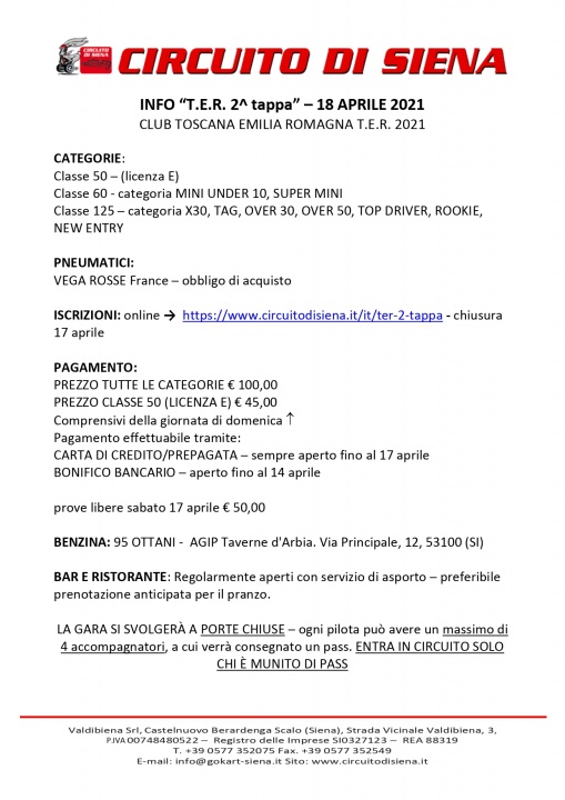 In riferimento alla gara CAMPIONATO CLUB T.E.R. 2021 sul Circuito di Siena in programma questo weekend 18 aprile 2021, ricordiamo che:
